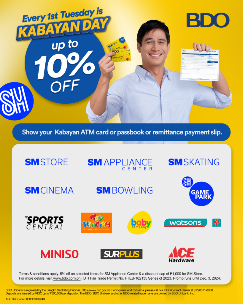 Ready to celebrate Kabayan Day? Visit your nearest SM branch on the first Tuesday of the month and don’t forget to bring your BDO Kabayan Savings ATM card, Passbook, or a validated remittance payment slip to avail the discounts.