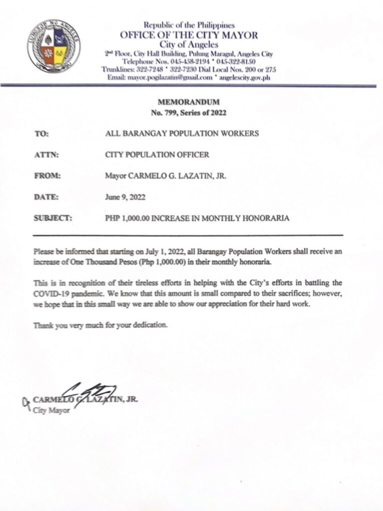 MAYOR Carmelo “Pogi” Lazatin Jr. will be giving additional P1,000 monthly honoraria to all 50 Barangay Population Workers beginning on July 1, 2022, as part of the city’s recognition to their hard work and dedication amidst the pandemic.