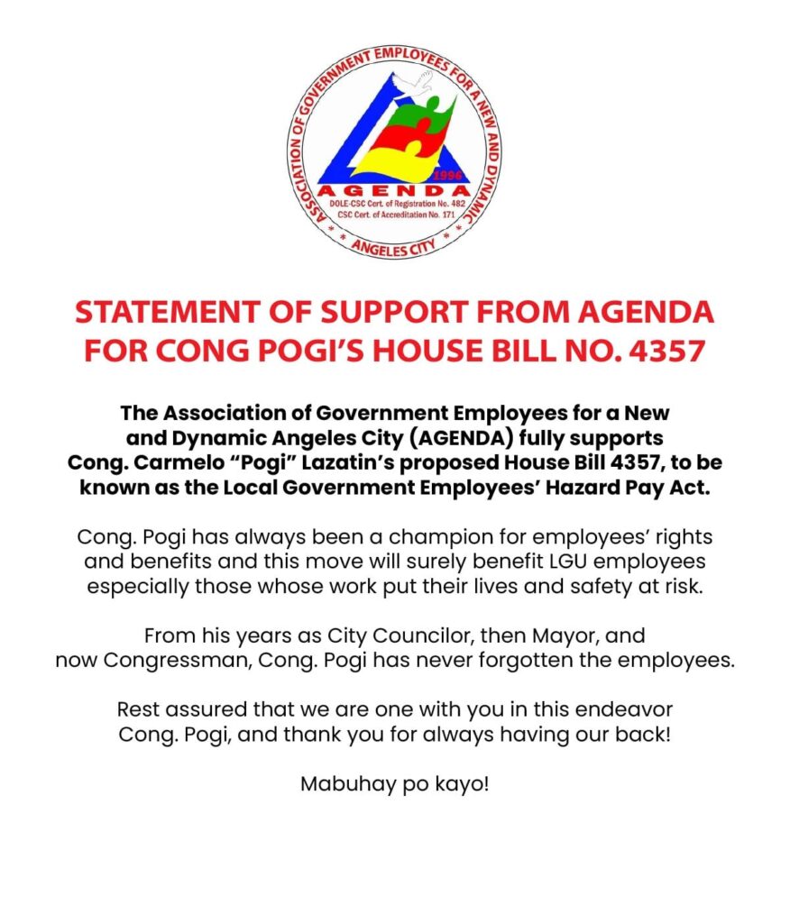 FIRST DISTRICT, Pampanga – The Association of Government Employees for a New and Dynamic Angeles City (AGENDA), on September 11, 2025, issued their statement of support for House Bill No. 4357, to be known as the “Local Government Employees’ Hazard Pay Act.”