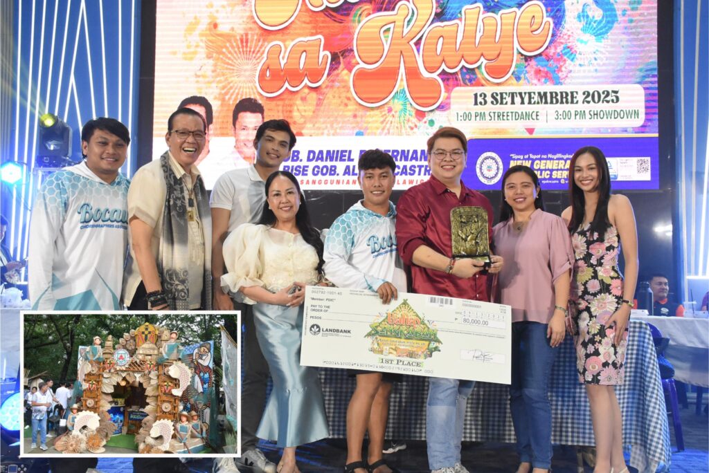 Mark Lorenzo (wearing red), the tourism officer of the Municipality of Bocaue, and other delegates from their town receive their trophy and ceremonial cheque worth P80,000 as they clinched the first place in Bahay Singkaban: Pista ng Ani, Kultura at Produktong Lokal presented by Crispin De Luna (second from left), Hari ng Singkaban 2025 Mico Jude M. Cruz, Provincial Administrator Antonia V. Constantino, PHACTO OIC Department Head May Arlene Torres (second from right), and Reyna ng Singkaban 2025 Angeli Kristine B. Alejandrino (far right).INSET: The winning Pagoda Festival-inspired booth of Bocaue.
