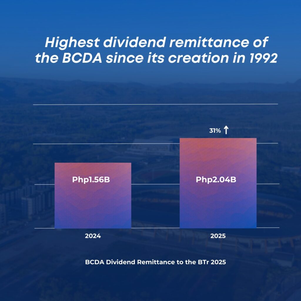 Dividends remitted by the Bases Conversion and Development Authority (BCDA) to the national government reached a record-high of P2.04 billion in 2025, marking a 30.68% jump from last year’s P1.56 billion.