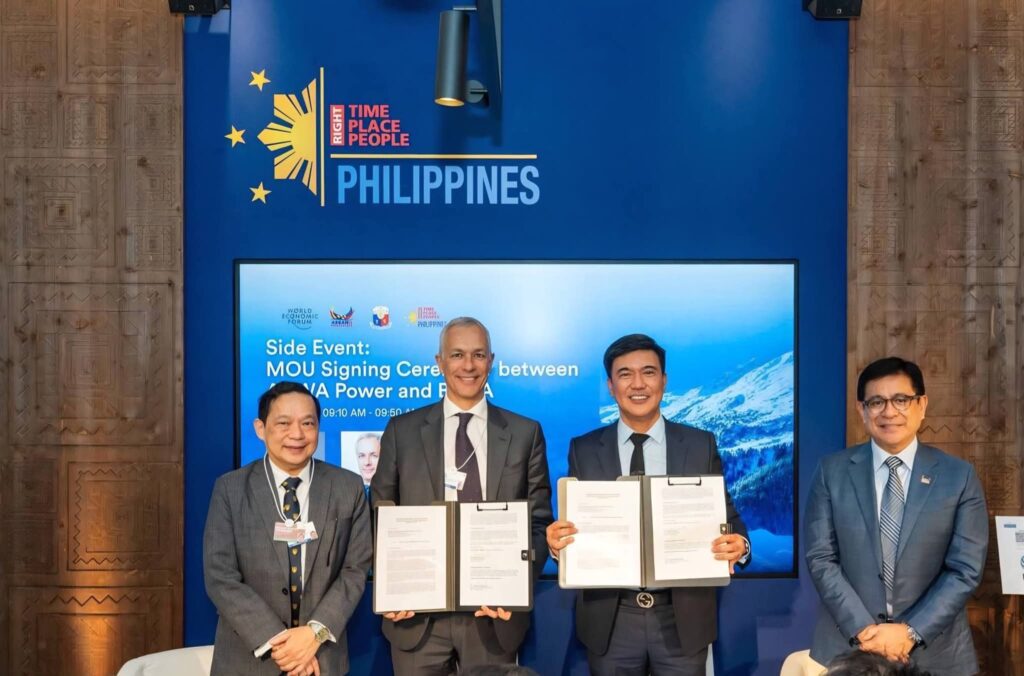 Bases Conversion and Development Authority (BCDA) President and Chief Executive Officer Joshua Bingcang (2nd from right) and ACWA Power Chief Executive Officer Marco Arcelli (2nd from left) sign a Memorandum of Understanding for the development of a renewable energy facility in New Clark City during the side event of the World Economic Forum 2026 in Davos, Switzerland. (BCDA)