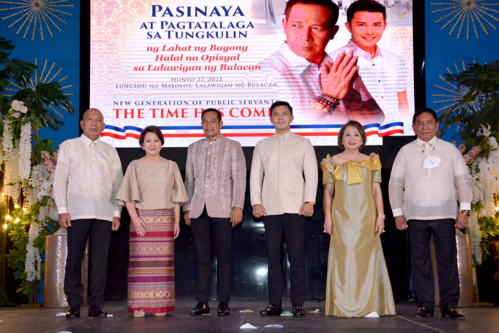 PEOPLE’S Governor Daniel Fernando and Vice Governor Alexis C. Castro (center) together with the newly elected house of representatives (L-R) Atty. Danilo A. Domingo of first district, Lorna C. Silverio of third district, Linabelle Ruth R. Villarica of fourth district and Ambrosio C. Cruz, Jr. of fifth district after their oath of office as congressional representatives during the “Pasinaya sa Tungkulin ng Lahat ng Bagong Halal na Opisyal sa Lalawigan ng Bulacan” at the Bulacan Capitol Gymnasium, City of Malolos, Bulacan June 27, 2022. Not in photo are Augustina Dominique C. Pancho of second district and Salvador A. Pleyto, Sr. of sixth district.