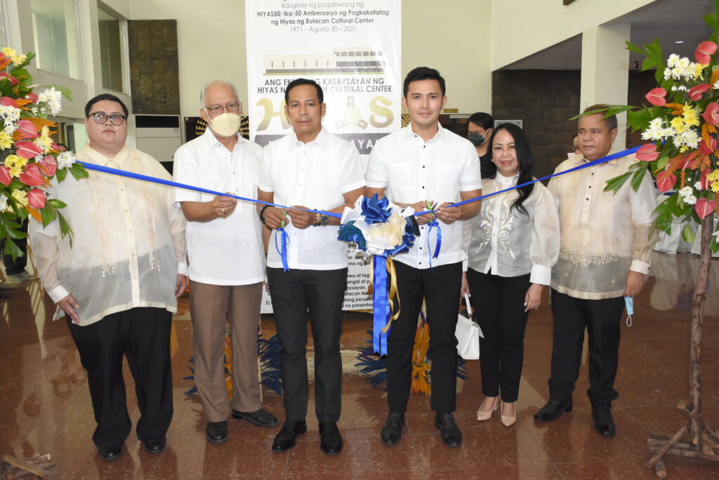 HIYAS50 RIBBON CUTTING CEREMONY. Governor Daniel R. Fernando together with Vice Governor-elect Alexis C. Castro leads the ribbon cutting ceremony of Ang Eksibit ng Kasaysayan ng Hiyas ng Bulacan Cultural Center in line with the celebration of HIYAS50: Ika-50 Anibersaryo ng Pagkakatatag ng Hiyas ng Bulacan Cultural Center at the Bulwagang Guillermo Tolentino, Hiyas ng Bulacan Cultural Center, Antonio S. Bautista Bulacan Provincial Capitol Compound, City of Malolos, Bulacan on Saturday (May 28, 2022). Joining them are (L-R) Provincial History, Arts, Culture, and Tourism Office Head Dr. Eliseo Dela Cruz, Vicente “Bong” Enriquez, president of the Women of Malolos Foundation, Inc.; Provincial Administrator Antonette Constantino and Chancellor Dr. Romeo Inasoria, representative of President Cecilia Gascon of Bulacan State University.