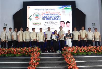 National Historical Commission of the Philippines (NHCP) Executive Director Carminda R. Arevalo, representative of Director Dr. Regalado Trota Jose, receives the certificate of appreciation and a miniature of the Barasoain Church from Bulacan Gov. Daniel R. Fernando and Vice Gov. Alexis C. Castro as tokens of gratitude for gracing the 447th Founding Anniversary of the Province of Bulacan as the guest of honor, held at The Pavilion, Hiyas ng Bulacan Convention Center, City of Malolos, Bulacan earlier today. Also in the photo are (from left) Board Member Casey Tyronne E. Howard, City of San Jose Del Monte Chief of Staff Juan Miguel P. San Pedro, Board Members Efren C. Bartolome, Jr., Renato DL. De Guzman, Jr., Paombong Mayor Engr. Mark Ian P. Marcos, Balagtas Mayor Adrian J. Santiago, Bulacan 6th District Congressman Salvador A. Pleyto, Marilao Mayor Atty. Jemina M. Sy, Board Members Josef Andrew T. Mendoza, Michael A. Aquino, Fortunato SJ. Angeles, and Richard A. Roque.