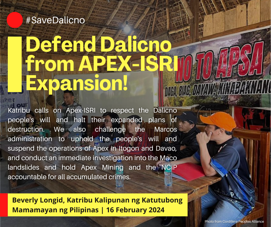 Katribu calls on Apex-ISRI to respect the Dalicno people’s will and halt their expanded plans of destruction. We also challenge the Marcos administration to uphold the people’s will and suspend the operations of Apex in Itogon and Davao, and conduct an immediate investigation into the Maco landslides and hold Apex Mining and the NCIP accountable for all accumulated crimes. Dalicno succeeded against mining development firms in the past, and the people of the community continue to uphold the same principles of justice and self-determination in the current struggle they face now. Let us join the Dalicno in their defense of their land and resources!