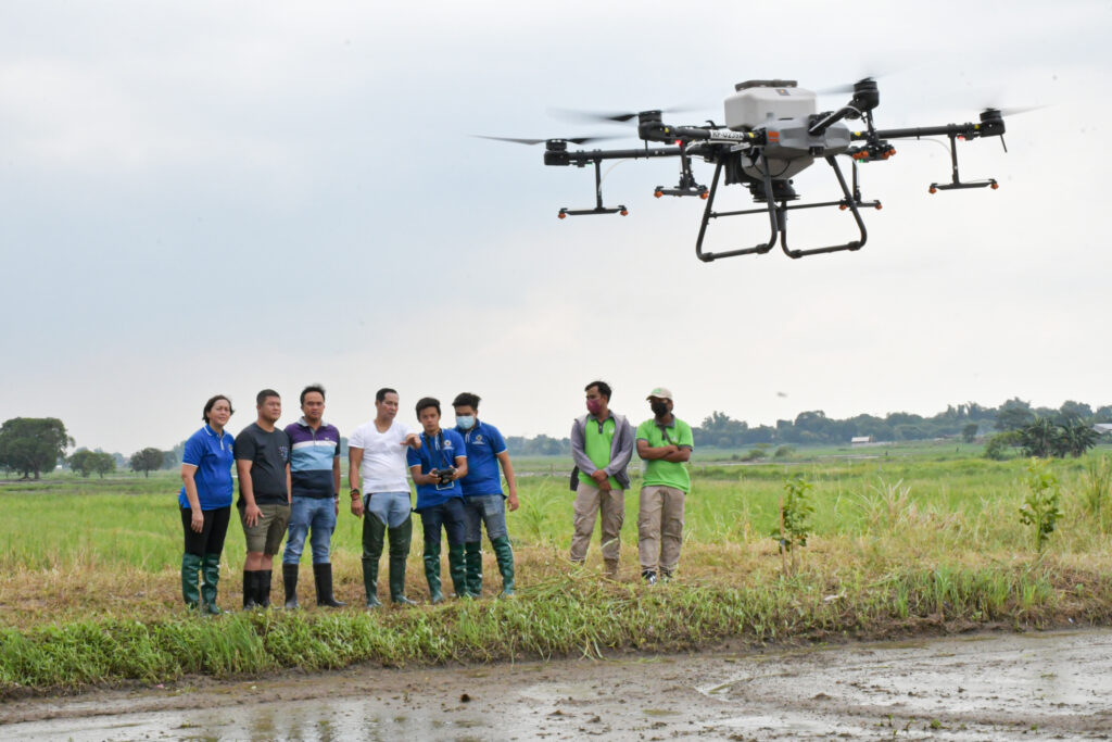Sinaksihan nina Gob. Daniel R. Fernando at Punong Bayan Mark Cholo I. Violago ng San Rafael ang unang pagpapalipad ng multi-tasking agricultural drone kasama sina Panlalawigang Pinuno sa Pagsasaka Ma. Gloria Carrillo at Bokal Romeo V. Castro, Jr. sa bukirin ni Elizabeth Esguerra sa Brgy.Pinac-pinacan, San Rafael, Bulacan noong Martes na inaasahang makatutulong upang mapababa ang gastusin at pataasin ang kita at ani ng mga magsasaka gayundin ay makapag-ambag sa pagseseguro ng pagkain sa bansa. (PPAO Photo)
