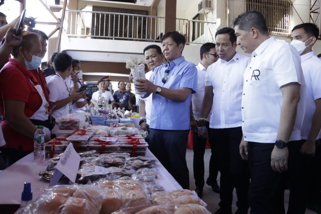 President Ferdinand R. Marcos, Jr., together with 6th District Representative Salvador Pleyto, Governor Daniel R. Fernando, Vice Gov. Alex Castro and and City of San Jose del Monte Mayor Arthur Robes, checks out a mushroom, one of the many products available at the Kadiwa ng Pangulo in Brgy. Dulong Bayan, City of San Jose del Monte, Bulacan during a presidential visit in Bulacan on April 19, 2023.