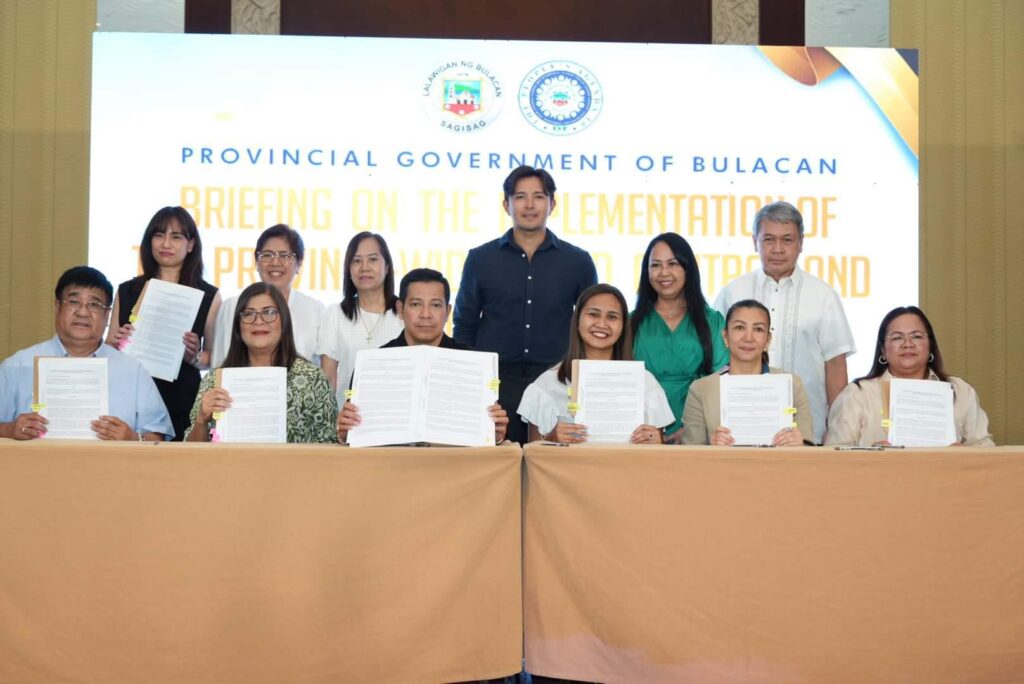 The signing of memorandum of agreement for the inter-LGU integration in the UHC Province-wide health system spearheaded by Bulacan Governor Daniel R. Fernando with local chief executives including (seated from left) Marilao Mayor Henry R. Lutao, Norzagaray Mayor Ma. Elena Germar, Plaridel Mayor Jocell Aimee R. Vistan-Casaje, Calumpit Mayor Glorime M. Faustino, Hagonoy Mayor Flordeliza C. Manlapaz, and (standing from left) Guiguinto Mayor Agatha A. Cruz among others during the Briefing on the Implementation of the Province-wide Flood Control and River Restoration Program at Isla Ballroom 3 Tower Wing, EDSA Shangri-La Manila, Mandaluyong recently. Also present in the event are (standing from left) Dr. Hjordis Celis, Provincial Health Officer II, Dr. Emily Paulino of the Department of Health-Bulacan, Vice Governor Alexis C. Castro, Provincial Administrator Antonia V. Constantino, and Provincial Health Office-Public Health Office Head Dr. Edwin P. Tecson.