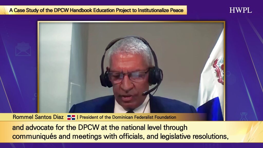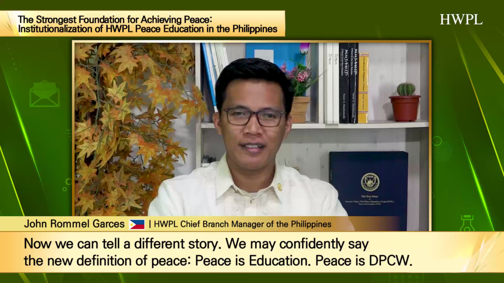 Binahagi ni G. John Rommel Garces, Chief Branch Manager ng HWPL Philippines na ang Artikulo 10 ng DPCW na “Pagpapalaganap sa Kultura ng Kapayapaan” ay nagbigay-daan para sa Peace Education upang “maabot ang puso ng bawat mag-aaral”. Ang Peace Education ng HWPL ay kasalukuyang nang itinuturo sa Pilipinas, mula elementarya hanggang kolehiyo.