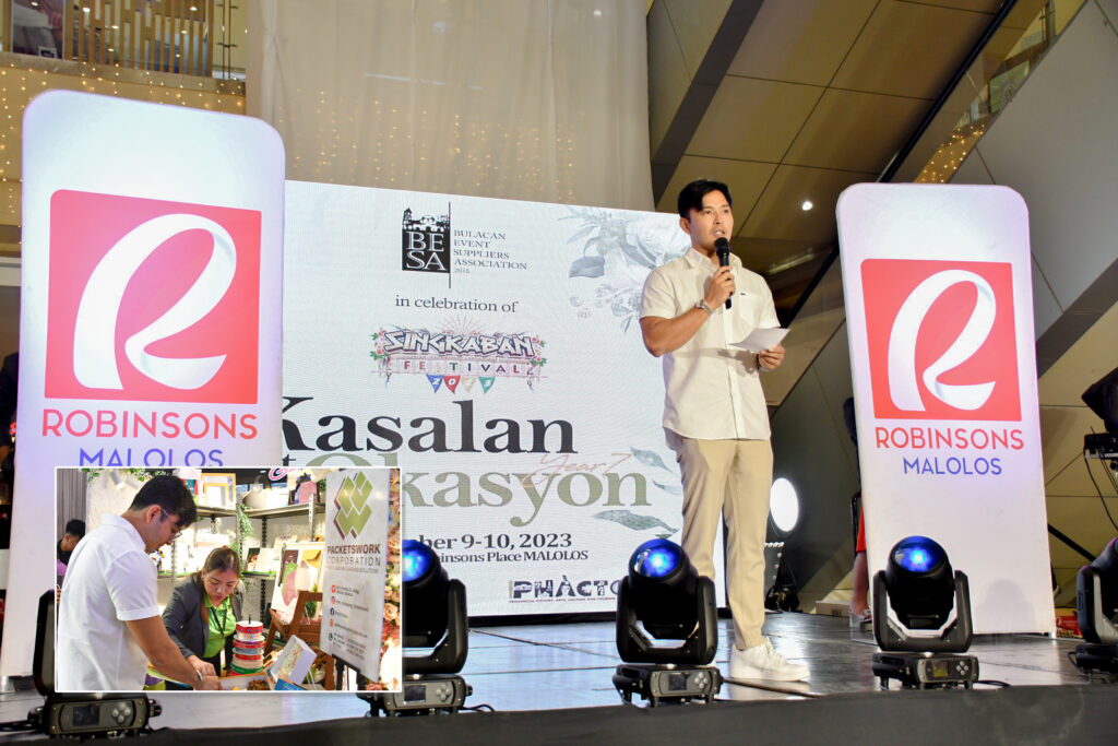Nagbigay ng kanyang mahalagang mensahe si Bise Gob. Alexis C. Castro sa pagbubukas ng Kasalan at Okasyon: BESA Bridal and Events Fair Exhibit” kamakailan sa Robinson’s Place Malolos, Lungsod ng Malolos, Bulacan bilang bahagi ng isang linggong pagdiriwang ng Singkaban Festival 2023. INSET: Binisita ni Castro ang mga lumahok na exhibitor sa fair kabilang na ang Packetswork Corporation Print and Packaging Solution.