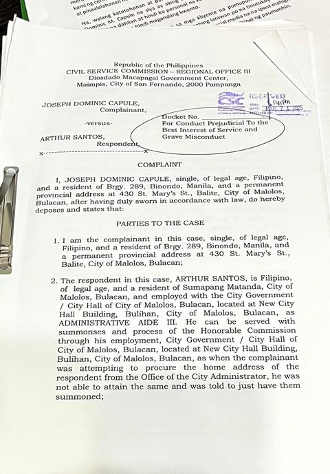 Ang mga kasong administratibo ay isinampa ni Joseph Dominic Capule, negosyante, residente ng Barangay 289, Binondo, Manila laban kay Arthur Santos, residente ng Sumapang Matanda, City of Malolos, Bulacan, at empleyado sa nasabing Pamahalaang Lungsod ng Malolos mula sa tanggapan ng Assessor’s Office.