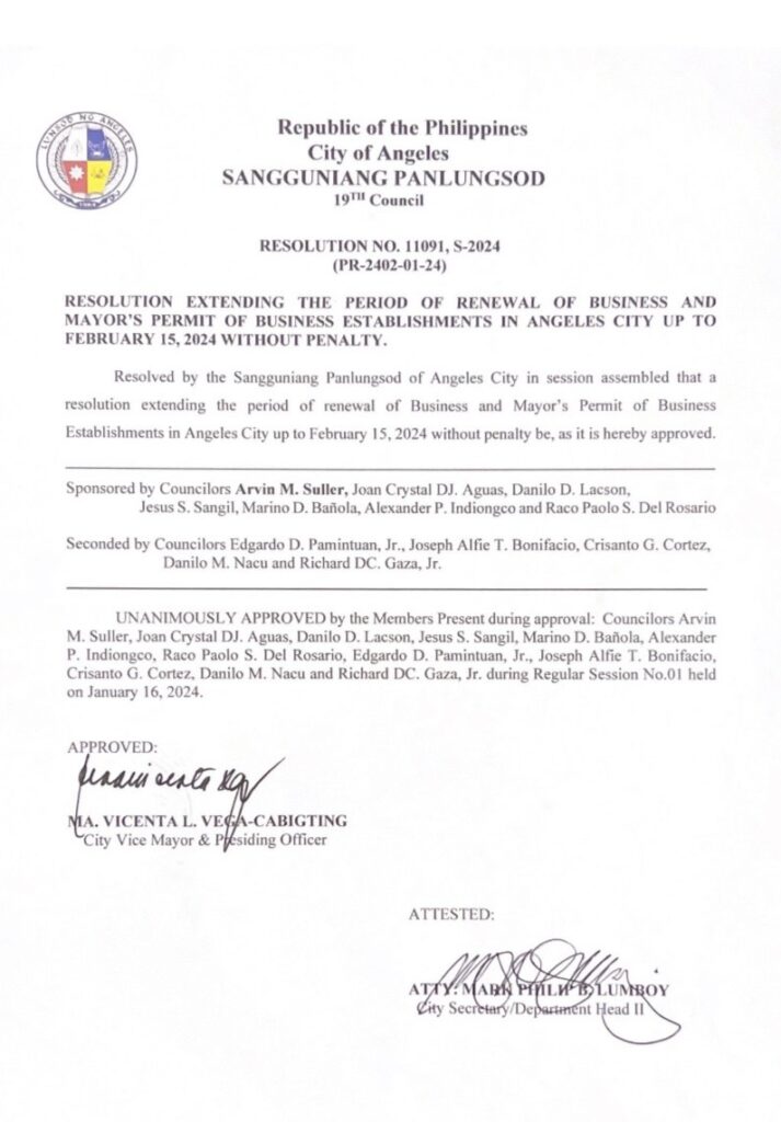 Angeles City Vice Mayor Ma. Vicenta Vega-Cabigting signed Resolution No. 11091, S-2024 extending the period of renewing business permit in the City.