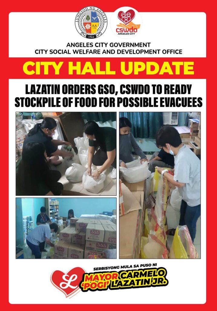 ANGELES CITY — Mayor Carmelo “Pogi” Lazatin, Jr. has instructed General Services Officer Evangeline Malonzo and City Social Welfare and Development Officer Edna Duaso to ready food stockpile for possible evacuees.