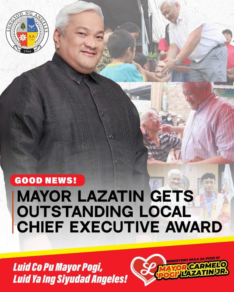 For his unwavering dedication to improving social welfare and development of Angeles City residents, Mayor Carmelo “Pogi” Lazatin Jr. was named “Outstanding Local Chief Executive of the Philippines, Highly Urbanized City Category for Luzon.”