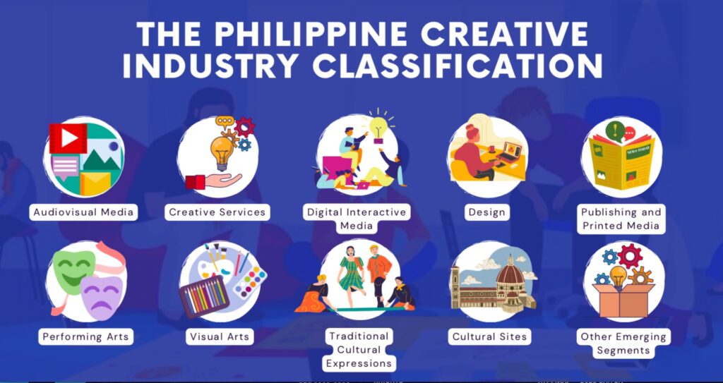 Kabilang sa mga tinukoy na nasa tinatawag na Creative Industry ay ang Audiovisual Media, Creative Services, Digital Interactive Media, Design, Publishing and Printed Media, Performing Arts, Visual Arts, Traditional Cultural Expressions, Cultural Sites at iba pang sumisibol na creative initiatives.
