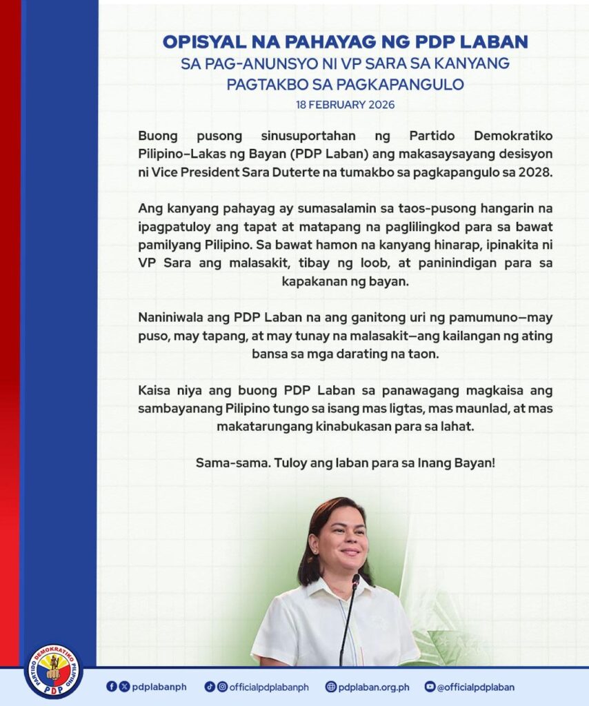 Buong pusong sinusuportahan ng Partido Demokratiko Pilipino–Lakas ng Bayan (PDP Laban) ang makasaysayang desisyon ni Vice President Sara Duterte na tumakbo sa pagkapangulo sa 2028.