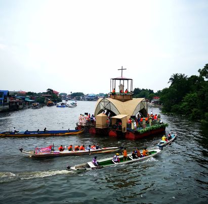 Sa Pagoda ay yari sa light metal barge, buho ng kawayan at sako kung saan dito nakasakay ang relic na “Krus Sa Wawa” na pinaniniwalaang miraculous cross.