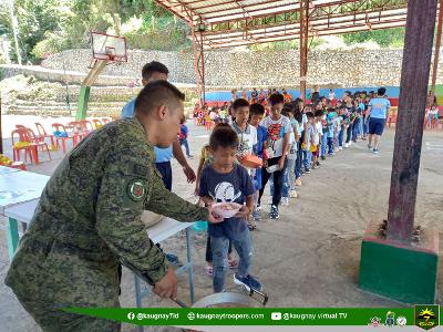Soldiers from 71IB together with policemen from Tubo Municipal Police Station distributed school supplies, reading books, hydration kit, clothes and toys for each IP pupil.