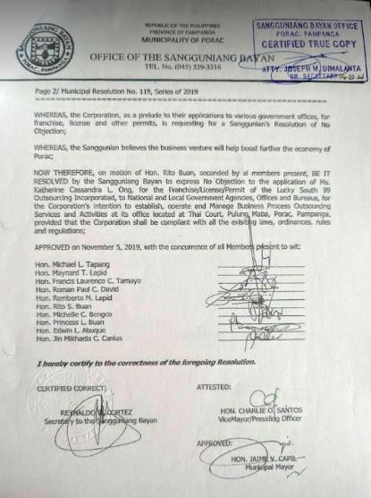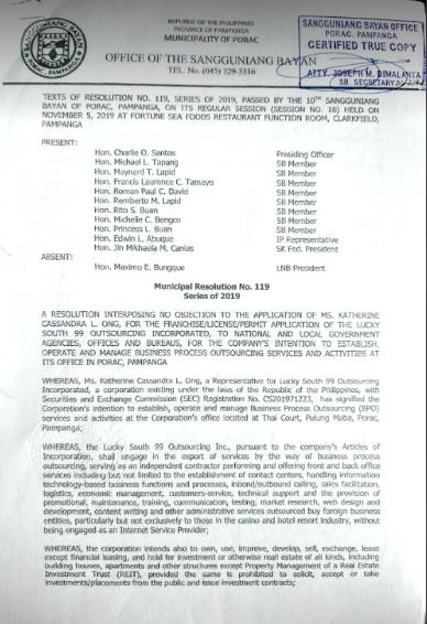 Ang Municipal Resolution 119 Series of 2019, ay “resolution interposing no objection to the application of Ms. Katherine Cassandra L. Ong, for the franchise/license/permit application of the Lucky South 99 Outsourcing Incorporated, to national and local government agencies, offices, and bureaus, for the company’s intention to establish, operate and manage Business Process Outsourcing Services and activities at its office in Porac, Pampanga”.