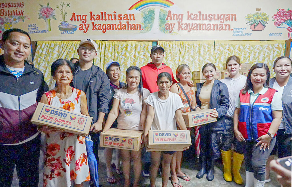 Some of the residents of San Isidro, Hagonoy holding the boxes of relief supplies personally delivered by Gov. Daniel R. Fernando, Vice Gov. Alexis C. Castro, and Hagonoy Mayor Ma. Rosario Sy-Alvarado-Mendoza at Eugenio Sy Tamco Elementary School in the said barangay last July 22. Also in the photo are (far left) Board Member Michael Aquino, (third from right) Board Member Romina Fermin, Provincial Social Welfare and Development Office Head Rowena Tiongson, and Hagonoy Vice Mayor Jhane Dela Cruz.