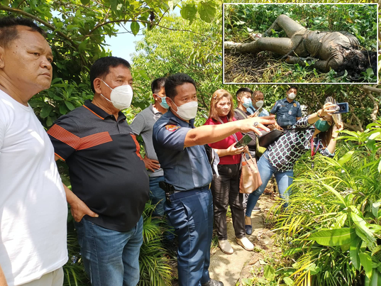 Itinuturo ni LtCol Luis Guicit, hepe ng Guiguinto Police kay Cong. Ambrosio Cruz Jr. at Kapitan Celso Hernandez ang lugar kung saan natagpuan nitong Martes (July 5) ng hapon ang naaagnas na bangkay ni Princess Dianne Dayor, 24, (inset) sa isang lote sa Barangay Tikay, sakop ng Malolos City. Kuha ni ERICK SILVERIO