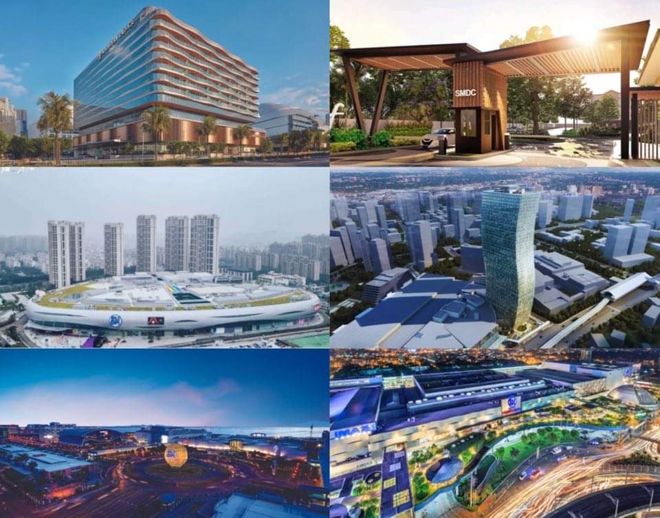 From Left to Right, Top to Bottom: Lanson Place, SM Development Corporation (SMDC) Turf Residences, SM City Yangzhou in China, SM Mega Tower, SM Mall of Asia Complex, and SM City North EDSA