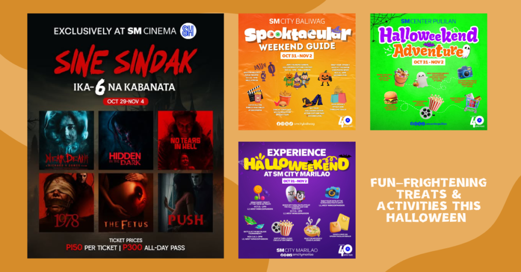If you are into full-blown scares, SM Cinema Marilao, SM Cinema Baliwag, and SM Cinema Pulilan are the ultimate destinations for you this Halloween. Now in its sixth year, SM Cinema presents Sine Sindak: Ang Ika-6 na Kabanata happening on October 29 to November 4. Watch ultimate horror flicks at P150 for a single pass, or go all-in with the Unlimited All-Day Pass for P300.