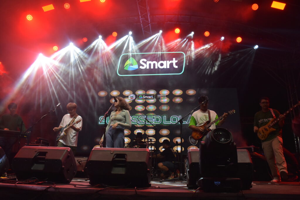 Sunkissed Lola composed of (L-R) Rodnie Resos on keyboard, Alvin Serito on guitar, Laura Lacbain on vocals, Dan Ombao on guitar, Danj Quimson on bass guitar, and (at the back) Genson Viloria on drums as they rock the jampacked Bulacan Sports Complex during the Singkaban Smart Con “Powered Up Youth’s Future” last Friday.
