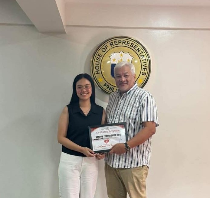 Congressman Carmelo “Pogi” Lazatin, Jr. awards a Certificate of Recognition and cash incentive to Makayla Elyanna Cato for being the Top 9 in the November 2025 Philippine Nurse Licensure Examination.
