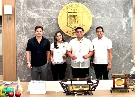 Vice Mayor Ferdie Estrella (2nd from right) of Baliwag City is the new president of Bulacan Vice Mayors League while VM Jane Dela Cruz (2nd from left) of Hagonoy town is the vice president during oath taking ceremony administered by Governor Daniel Fernando (right) witnessed by Vice Gov. Alexis Castro (left) held at Governor’s Office, Capitol Building, City of Malolos on August 4, 2025. Photo by ELOISA SILVERIO