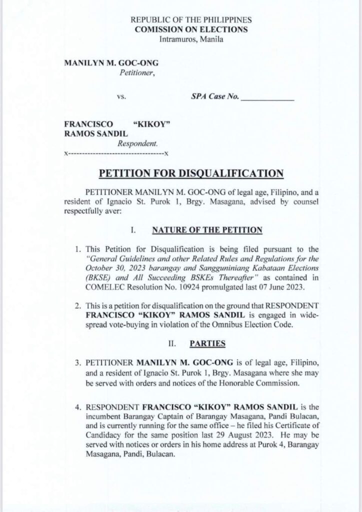 Samantala pilit naman idinidiin ang pangalan ni incumbent Kapitan Kikoy Sandil ng Masagana sa umanoy pamimili ng boto sa kaniyang nasasakupan matapos isang nagngangalang Manilyn Goc-Ong, residente ng Ignacio St. Purok 1, Masagana ang nagsampa ng “Petition For Disqualification” sa Commission On Election (Comelec).